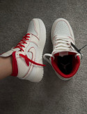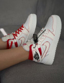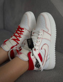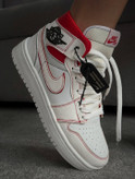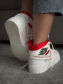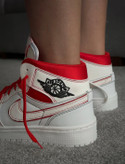 این ایرجردن ۱، یک مدل استاندارد نیست؛ بلکه یک رویکرد هنری به طراحی کلاسیک است. در نگاه اول، با یک کتانی سفید و تمیز روبرو هستید، اما با کمی دقت متوجه خطوط سرخرنگ و ظریف میشوید که در امتداد پنلهای کفش کشیده شدهاند. این خطوط، بدون پر کردن کامل رنگ، ساختار کفش را برجسته میکنند و ظاهری شیک، مینیمال و در عین حال جسورانه خلق میکنند.