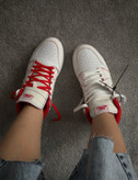 آن را با یک شلوار جین اورسایز (همانند تصویر) یا یک شلوارک ساده و یک تیشرت سفید بپوشید تا اجازه دهید خطوط قرمز کفش، مرکز توجه باشند.