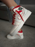 بندها و یقه قرمز آتشین: برای شکستن سادگی سفید و خاکستری، از بندها و پوشش داخلی یقه به رنگ قرمز پررنگ استفاده شده است. این جزئیات، گرما، هیجان و هویتی کلاسیک را به کفش تزریق میکنند.