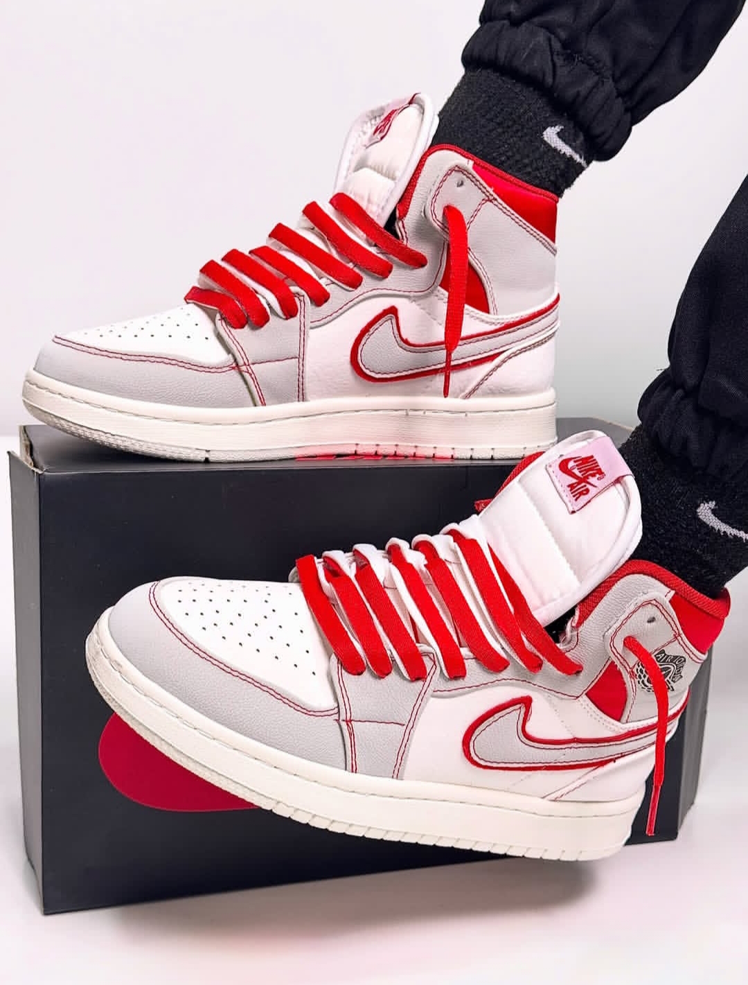 لوگوی خاص Air Jordan: لوگوی کلاسیک “بالها” (Wings Logo) روی ساق و زبان، با رنگهای قرمز و مشکی برجسته شدهاند تا اصالت برند جردن را حفظ کنند.